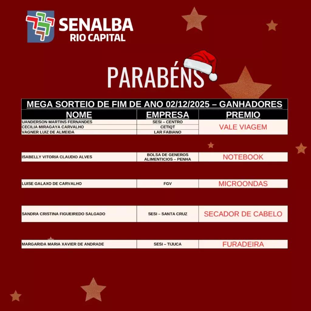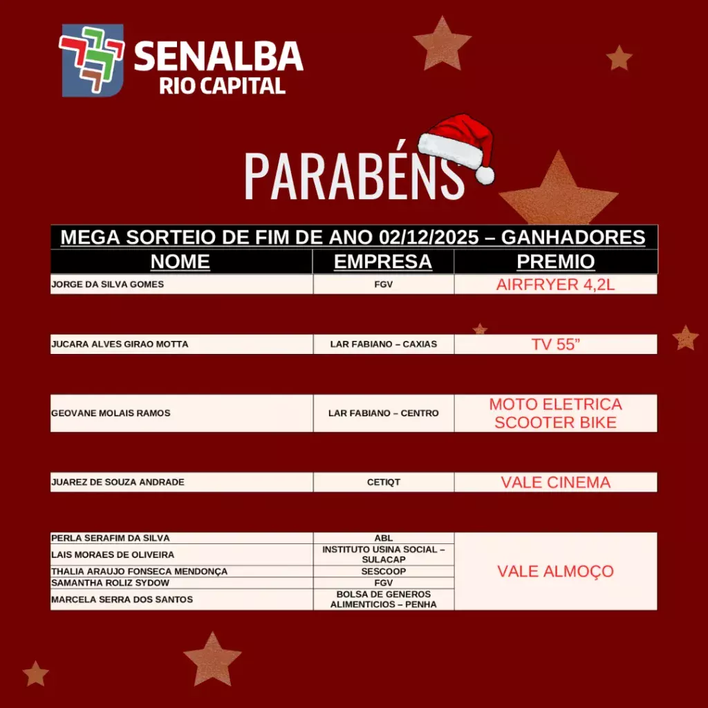 Lista oficial dos ganhadores do mega sorteio de fim de ano SENALBA RIO CAPITAL – 02/12/2025