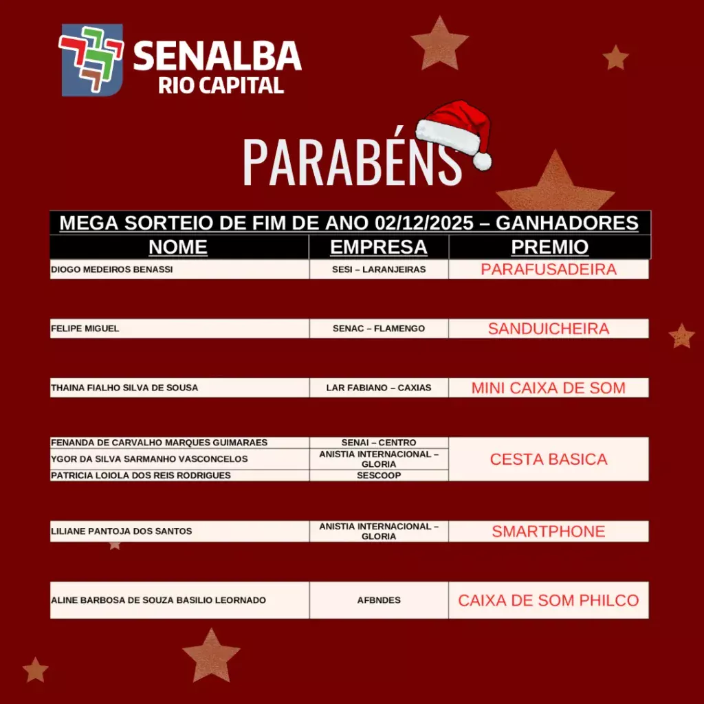 GANHADORES DO MEGA SORTEIO DE FIM DE ANO 02/12/2025 – SENALBA RIO CAPIAL & SENALBA RJ